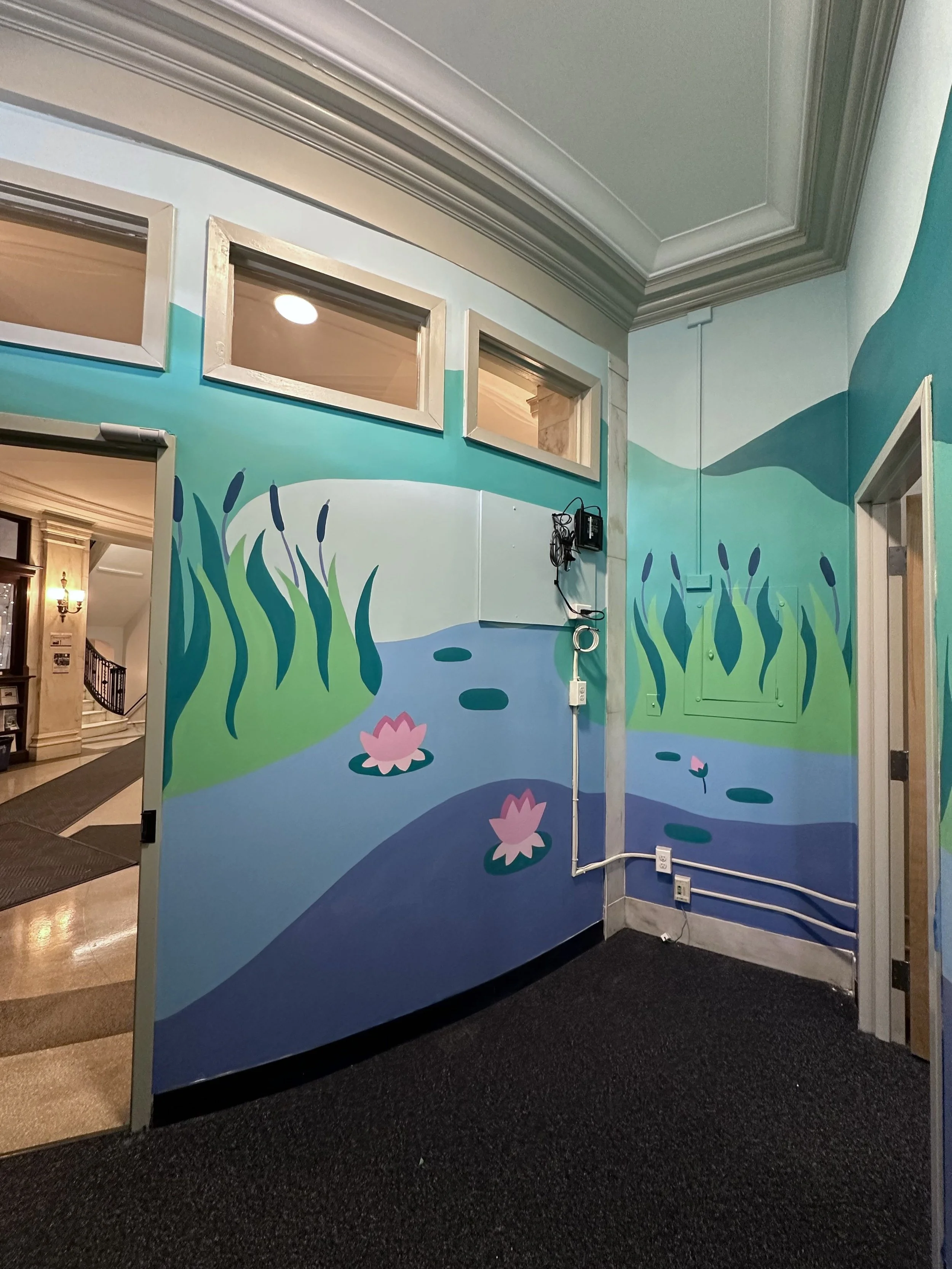 In 2024, I developed a series of murals for Newton City Hall’s Employee Wellness Space. The area consisted of three rooms, with a foyer connecting to two offices. To celebrate nature and foster a feeling of serenity, I decided to explore a pond theme. I also wanted each room to have its own distinctive charm, which led me to settle upon a motif for each room: a pond scene in the foyer, herons in the office, and koi fish in the other office. Given the unique quirks of each room and the paintable space, I decided to create an all-encompassing design in the foyer, two small murals in the heron room, and a full wall mural in the koi fish room.
